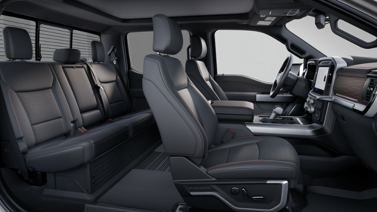Our Lariat 502A cabin supplies impressive luxury for long days, thanks to a twin-panel sunroof, heated/ventilated power ActiveX front seats, a heated premium-wrapped steering wheel, dual-zone automatic climate control, keyless access, and push-button ignition. Intelligent Ford technology is at your service with a 12-inch touchscreen, a 12-inch productivity screen, connected navigation compatibility, Bang & Olufsen audio, WiFi compatibility, Apple CarPlay, Android Auto, Bluetooth®, and voice control.